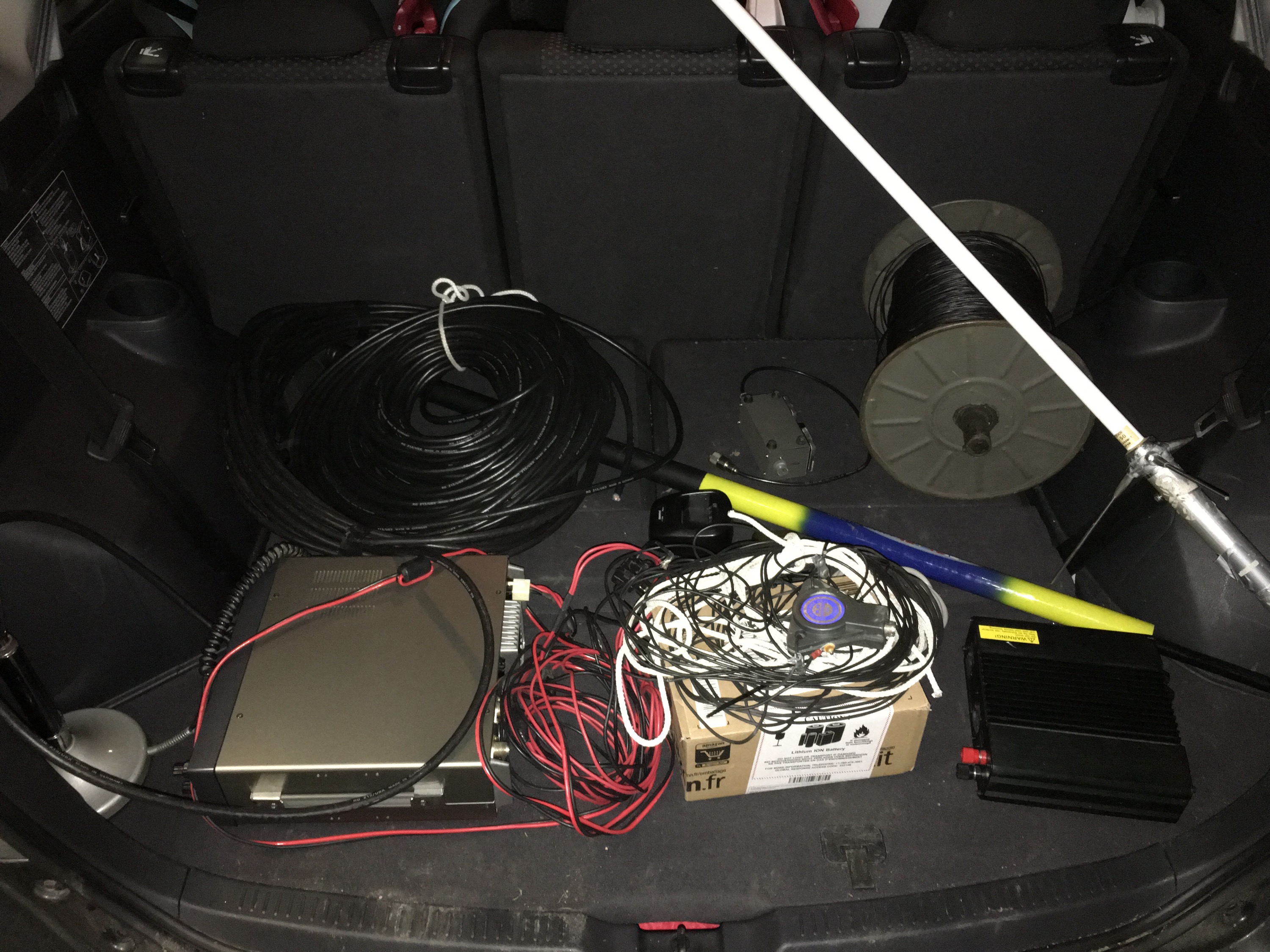 So, there’s my radio and mic in the bottom left corner, two large rolls of coax in the upper left, a box containing a multimeter and a bunch of coax contacts, a ~40 meter dipole (haven’t measured, but the auto tuner succeeds at 6-8MHz), a roll of thin wire – for antennas – in the top right corner, a VHF/UHF antenna even farther to the right, and – finally – a loaner 13.8V 30A power source for the radio. That SWR meter in between the coax and the wire roll is also a loaner.
